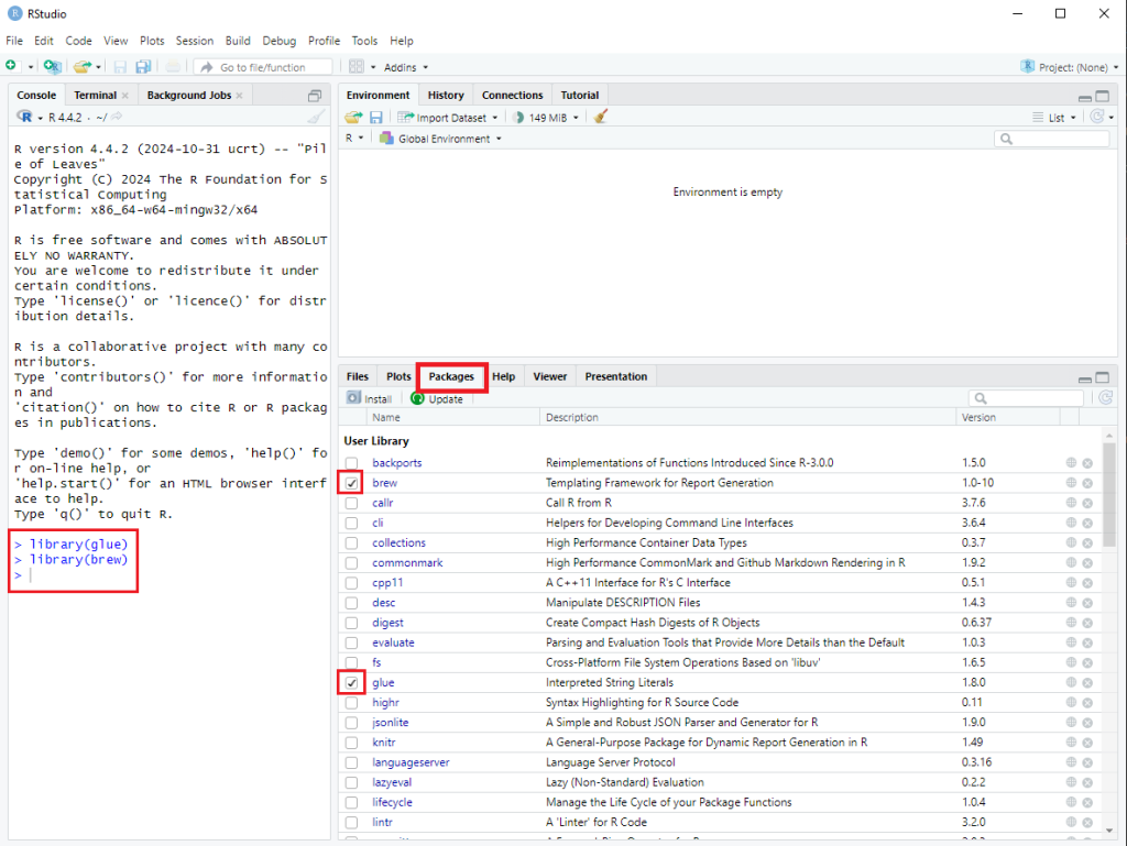 Prostredníctvom RStudio je možné stiahnuť knižnicu priamo v prostredí R. Stačí kliknúť na záložku Packages, ktorá sa nachádza v pravom hornom rohu. Následne sa zobrazí zoznam dostupných knižníc, kde je možné vyhľadať požadovanú knižnicu a zaškrtnúť ju. Po zaškrtnutí sa knižnica automaticky stiahne a nainštaluje do prostredia R.