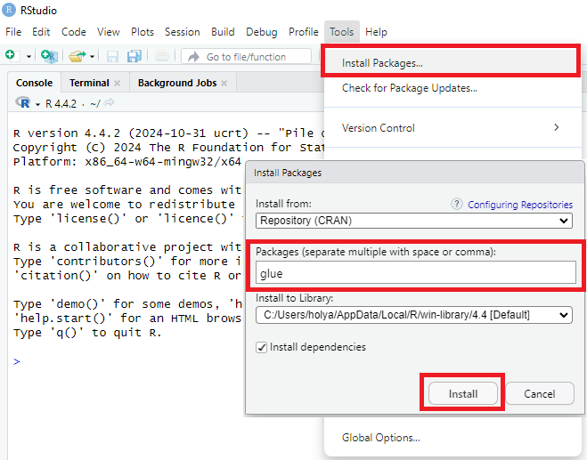 Ďalší spôsob, ako stiahnuť knižnicu, je kliknutím na Tools v hornej lište a následne kliknutím na Install Packages. Otvorí sa dialógové okno, kde je možné zadať názov knižnice, ktorú chcete stiahnuť.