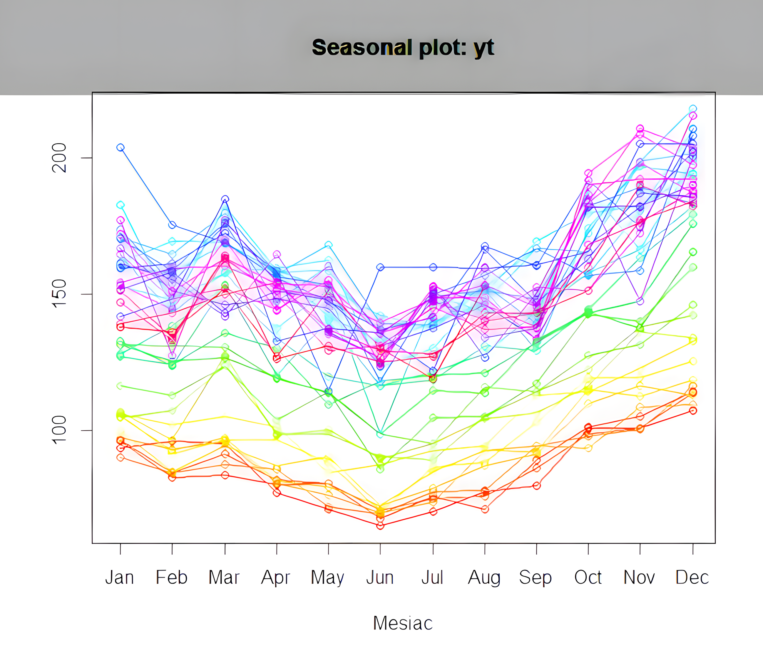 seasonplot(yt, col=rainbow(40), type="b", xlab="Mesiac")