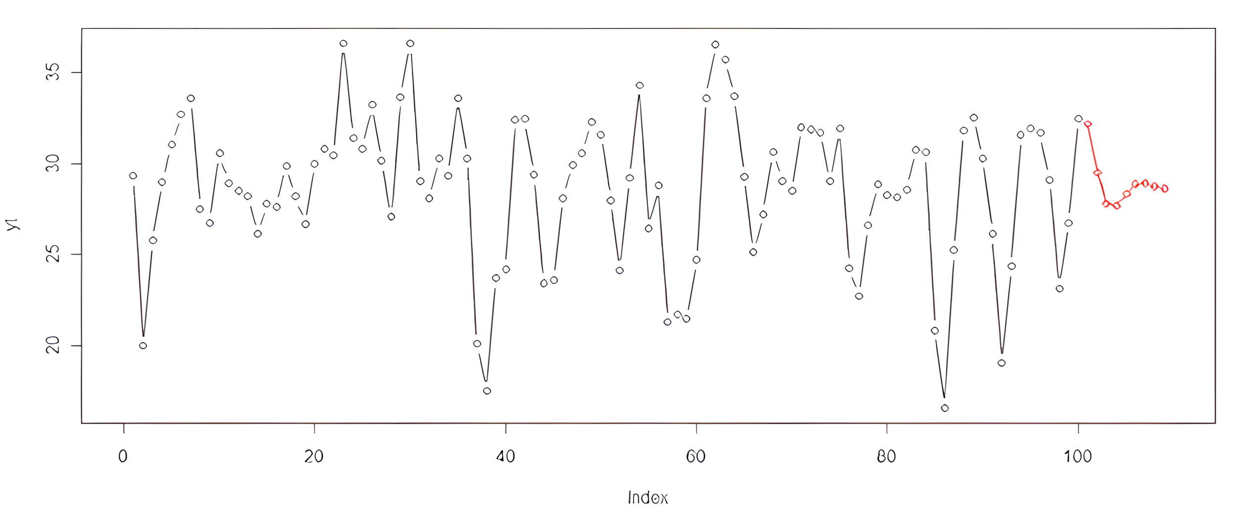 plot(yt, type = "b", xlim = c(0, 110)) lines(prog$pred, type = "b", col = "red")