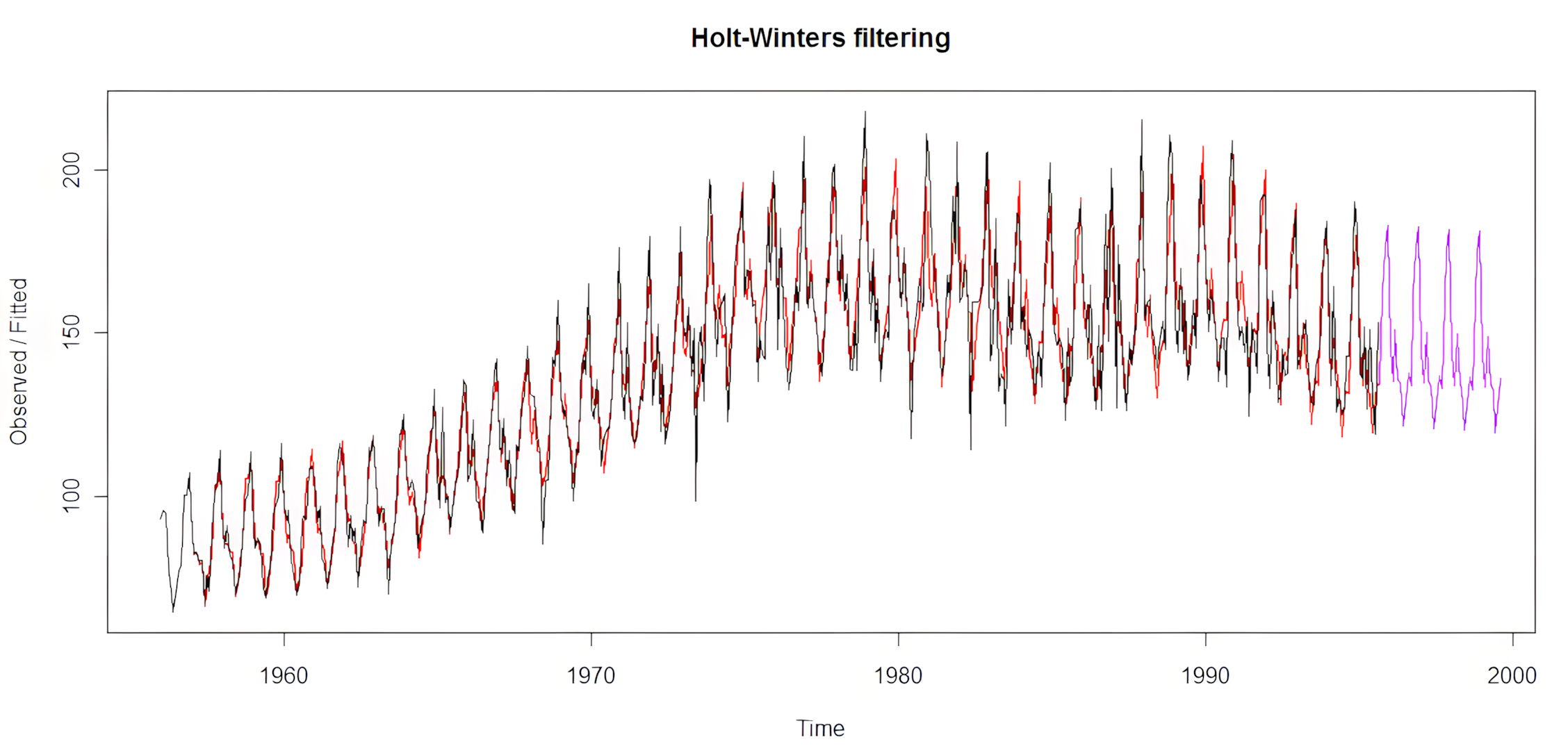 HoltWinters(x, alpha = NULL, beta = NULL, gamma = NULL, seasonal = c("additive", "multiplicative"))