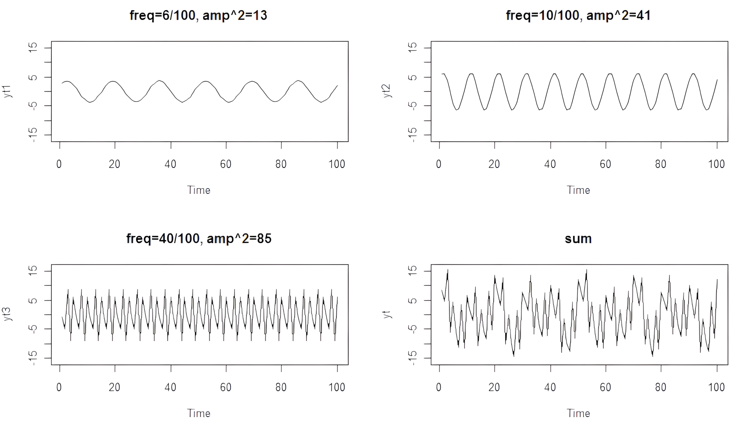 # definujeme rozsah t t = 1:100 # jednotlivé harmonické zložky yt1 = 2*cos(2*pi*t*6/100) + 3*sin(2*pi*t*6/100) yt2 = 4*cos(2*pi*t*10/100) + 5*sin(2*pi*t*10/100) yt3 = 6*cos(2*pi*t*40/100) + 7*sin(2*pi*t*40/100) # výsledný časový rad yt = yt1 + yt2 + yt3 # vykreslenie zložiek a ich súčtu par(mfrow=c(2,2)) plot.ts(yt1, ylim=c(-16,16), main="freq=6/100, amp²=13") plot.ts(yt2, ylim=c(-16,16), main="freq=10/100, amp²=41") plot.ts(yt3, ylim=c(-16,16), main="freq=40/100, amp²=85") plot.ts(yt, ylim=c(-16,16), main="Súčet harmonických zložiek")