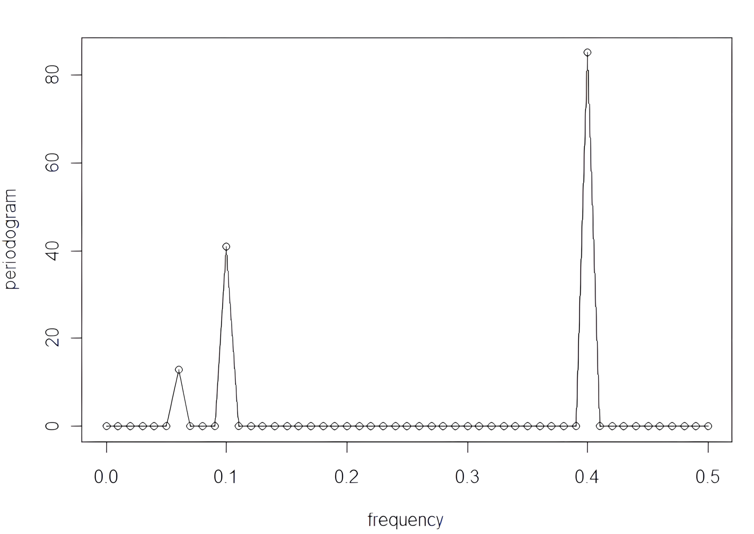 # výpočet periodogramu cez FFT P = abs(2 * fft(yt) / 100)^2 # frekvenčná os pre zobrazenie (0 až 0.5) f = 0:50 / 100 # vykreslenie periodogramu plot(f, P[1:51], type = "o", xlab = "frequency", ylab = "periodogram")