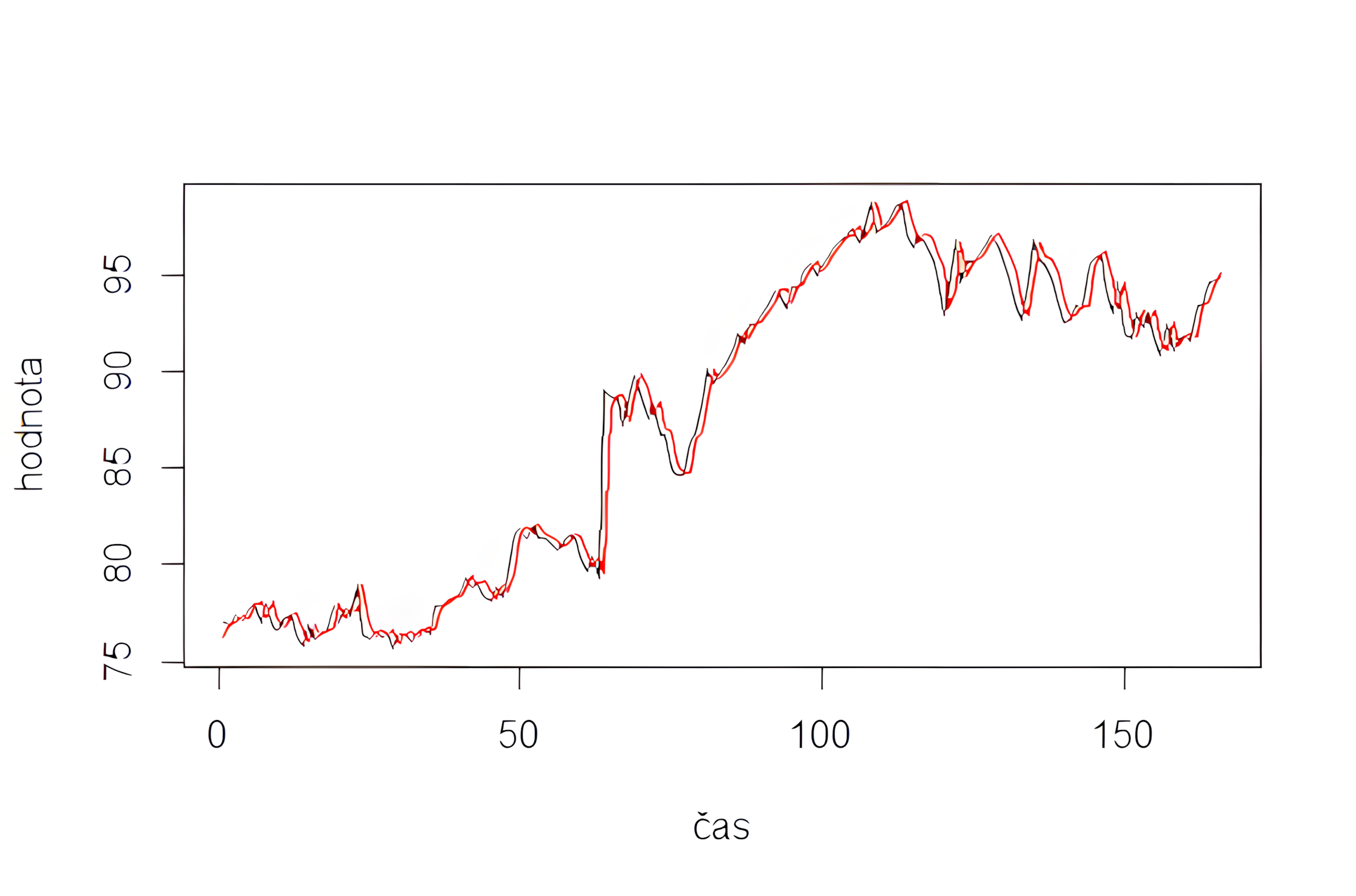 Červená čiara zobrazuje predikované hodnoty z modelu, ktoré by sa mali približovať k pôvodnému priebehu časového radu.